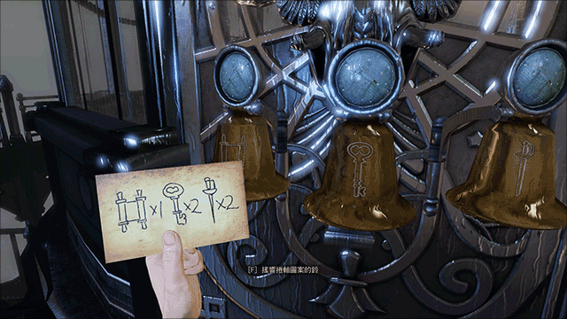 在线索图的指示下对左边第一个铃铛按下F键进行互动1次、对中间和右边的铃铛按下F键分别进行互动2次,之后就是剧情了
