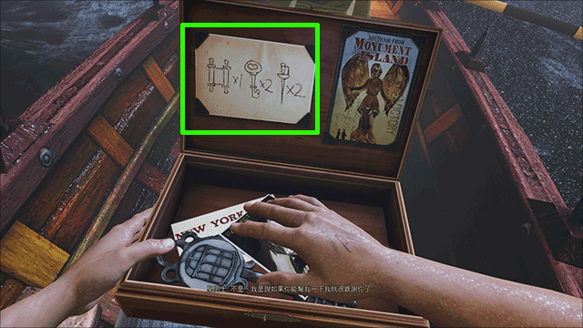 在前往灯塔的路上,玩家还会被赠与一个精美的盒子,这个盒子中包括绿色方框内的密码指示(剧情线索)、一座天使雕像指示图、一张女孩(伊丽莎白)照片、一个带有笼子的图案、一份女孩的信息纸片和一把毛瑟手枪(放心,这把枪你用不到);