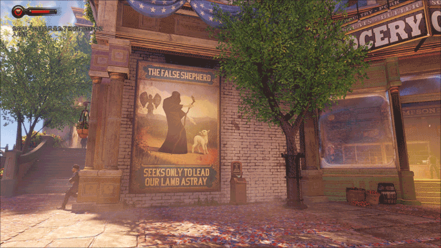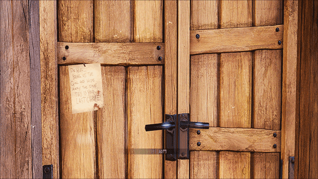 21、一路向前来到这扇门前(记得搜刮一番,包括垃圾桶、座椅底下、草丛中等),这里的英文是提醒市民提防虚假的牧羊人(主要和先知的宣传有关,主要是为了保护伊丽莎白);
