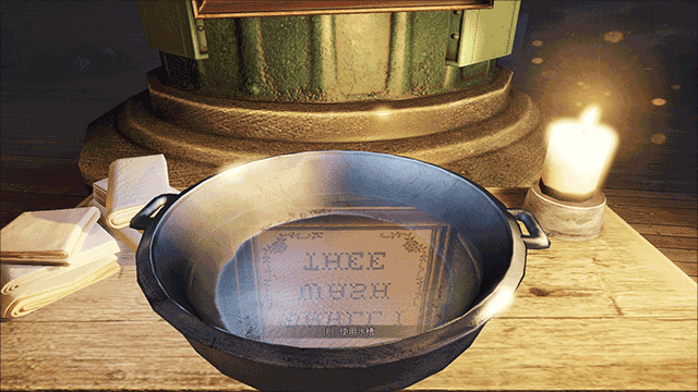 10、在推开了灯塔大门后,在里面会发现一个水盆,靠近它按下F键进行互动,这里可以让玩家第一次隐约的看见布克自己的基本面貌,洗完脸和手后,抬头一看便能知道这盆水的作用了:洗去你的污秽,才能前往天空之城;
