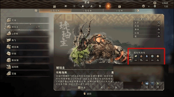 游戏中的武器共有五种不同的属性。不同怪物对属性的抗性各有不同,击败怪物后可以在图鉴界面查看属性弱点。