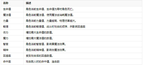 游戏属性分为生命值、魔法值2种基本属性,力量、敏捷、体力、智慧、精神、魔力、回避率、命中率8种状态属性。各项属性均可通过升级、更换装备来加强。