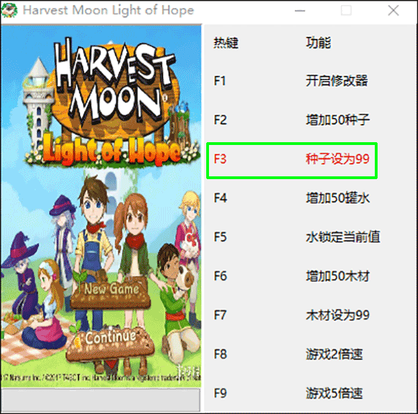 牧场物语希望之光是一款模拟类游戏,玩家将在牧场里饲养家畜、收集材料、种植作物等等,你还可以广交朋友,组建家庭,重燃小镇的灯塔,游戏不难,但是很多步骤很重复,而牧场物语希望之光修改器则可以帮助大家更好的玩好游戏,该修改器拥有修改经验、种子、木材、倍速等九大功能,通过简单的快捷键即可一键开启指定功能,提升玩家的游戏体验。不过为了避免数值太变态损失游戏乐趣,玩家还是适度为妙哦。喜欢的朋友就快来下载体验吧。PS:修改器使用特征码扫描制作,理论支持其他版本以及后续升级档本次修改器。