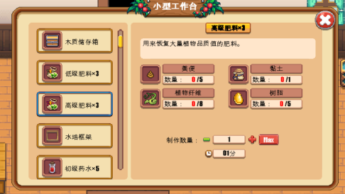 6、植物只有在适应的季节才会生长,在适应的温度下,植物的品质则会提升。一般来说在季节初期温度较低,这个时候种植农作物在收获之后品质都十分的优秀,售卖价格也会更高。而在季末的时候由于气温的变化,有些植物没有在最优的气候进行生长,植物品质就会开始下降影响植物的售卖价格。这个时候在屏幕的右下角就会出现叹号提示某种农作物的品质正在下降,为了不让气候影响农作物的生长,就需要给植物施肥,在工作台可以使用动物的粪便和树脂粘土来合成。在季节快要结束的时候玩家们如果想要获得更好的收益一是要选择拥有高适应性的植物来种植,二则是准备大量的肥料来给植物施肥。