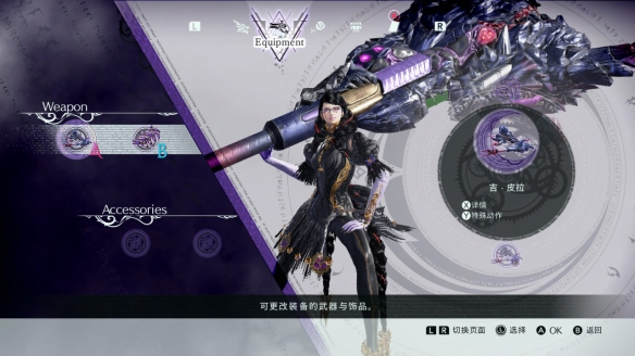 装备界面,玩家能调整武器和饰品。武器影响贝优妮塔的攻击模式,可以同时装备两把武器,战斗中按L键切换。饰品则会带来一定的属性能力加成。