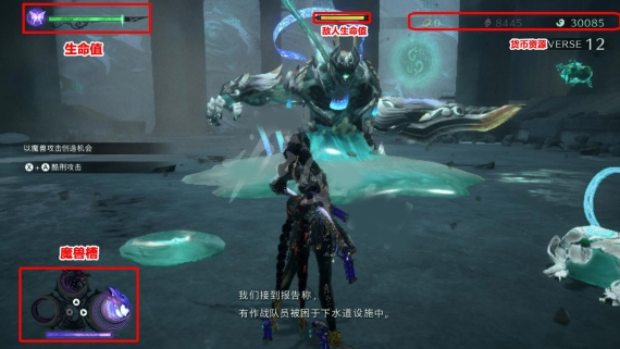 在战斗中画面左上角为角色的生命值。左下叫则为魔兽槽,本作中贝优妮塔最多可以同时装备三个恶魔奴隶。玩家可以通过十字键进行切换。召唤恶魔奴隶需要消耗消耗下方紫色的魔力槽。魔力槽被消耗后会随时间恢复,攻击以及进入魔女时间都能快速增加魔力槽。