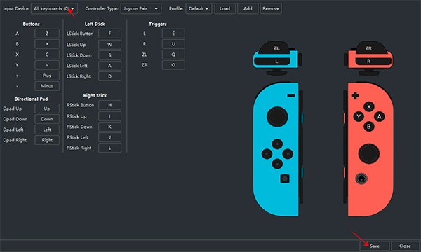 4、如果有手柄的话点击左上角Input Device选项并选中自己的输入设备即可,之后点击右下角的Save按钮保存配置;