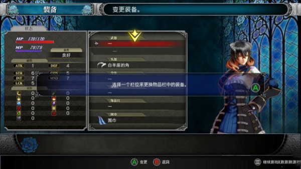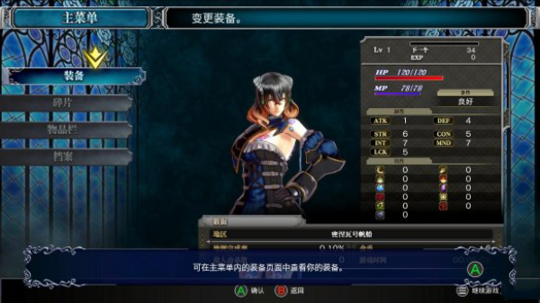 当玩家获得装备道具时可以点击R来开启主菜单,这里可以看到人物的当前属性和状态,同时能够进行道具使用和装备更换等操作。