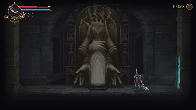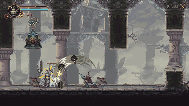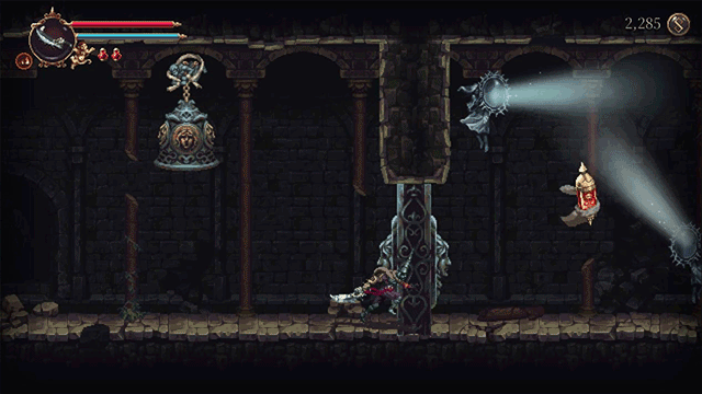 虽然战争香炉无比超模,但这并不代表着其他武器就会被放弃。《神之亵渎2》初期的探索方向可以自由选择,不同的探索路径中总会有各类特殊场景,这些场景的触发条件则对应三把不同的武器。所以,不同的武器还代表着不同的流程方向--战争香炉可以敲钟解锁铁门;吸血剑可以垂直破坏下方阻碍;双剑可以穿梭于镜子,抵达没有落脚点的远处。