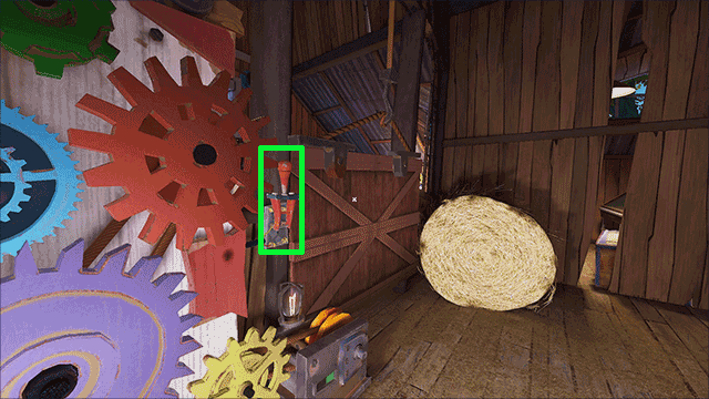 19、最后把红色齿轮安置在红色圆盘上即可拉到闸门开关,开启农场的门了;