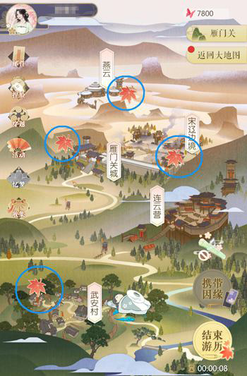 3、在游历场景可以看到有红色枫叶图标,点击枫叶可以触发故事剧情。过完故事剧情可以获得各种奇物、奇观、书信奖励。你也可以选择挂机,等待自动触发奇遇。
