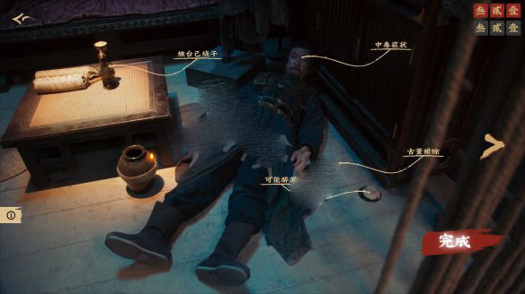 随后进行观察,凶案现场需要观察烛台、不良帅面部、古董蟾蜍和地上的酒碗。
