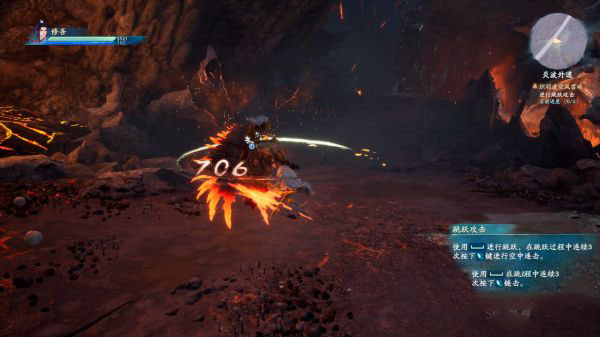 开始操作角色,首先是最简单的移动、调整视角、跳跃、加速跳跃、闪避等等。接下来会看到一只拦路的迦楼罗魔,它就是新手的战斗教程。进行普通攻击、跳跃攻击的学习后,击杀它就能继续前进了。