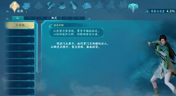 最后这三个没有开放,我不知道是介绍什么,只能根据图标猜测,第一个是山的造型,我怀疑是野外场景介绍。第二个应该是御剑地图,第三个应该是御灵图鉴