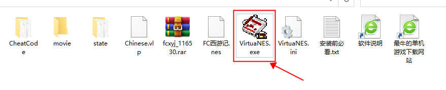 2、接着先打开文件中如下图箭头所指向的模拟器VirtuaNES.exe。