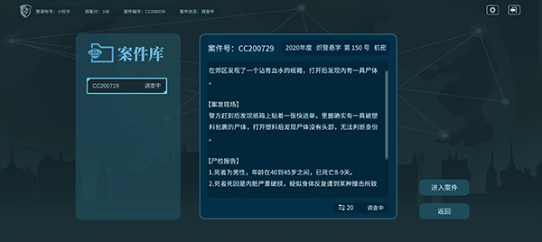 玩家需要仔细阅读、筛选信息,检索关键词,查找关键信息和新的线索。最终把碎片化的线索拼接完整(也可利用内置的线索分类和笔记功能),并推理出案件的发生经过,成功找到案件关键问题的答案。成功破案后,还可以根据真凶的“犯罪陈述”进行复盘。