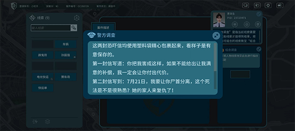 《真探》是一款在Steam平台上非常受欢迎的文字推理解密游戏,玩家需要像侦探一样抽丝剥茧地破案。游戏里每个案件都有大量线索,比如快递单号、恐吓信、监控记录等等,你需要仔细分析这些信息来找出真相。如果遇到困难,还可以向系统求助,但会扣分哦!最终,警方会根据你的表现给出评价。