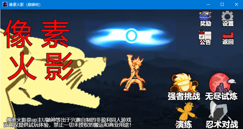 像素火影巅峰斑是由u鼬神和像素小恶魔共同打造的一款火影同人格斗电脑游戏,游戏玩法拥有多种不同的模式,比如人机对战、强者挑战、无尽试炼、忍术对战等,每个模式都可以带来不一样的游戏体验,可以满足不同玩家的喜好需求。