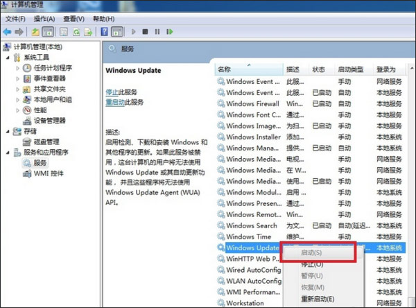 5、此时再打开原来的“计算机管理”窗口中依路径“服务和应用程序——服务”打开,在列表中找到“Windows Update”并单击右键选择“启动”,此时再安Microsoft .NET Framework 4.54.0的安装包就能顺利通过了。