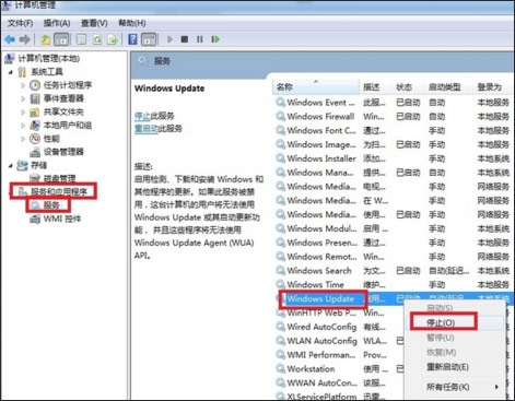 2、在打开的“计算机管理”窗口中依路径“服务和应用程序——服务”打开,在列表中找到“Windows Update”并单击右键选择“停止”。