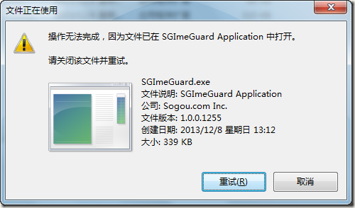 将SGImeGuard.exe删除,删除后不影响搜狗的使用。删除时提示如下,