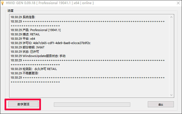hwid gen是目前互联网上非常优秀的一款win10永久激活工具,一般又称为hwidgen数字激活工具,由国外大神开发,只针对win10有效,能够自动获取Windows10数字许可证激活,无需产品密钥,以最简单的方式永久激活系统,支持win10正式版、企业版、教育版、专业工作站、专业版等。软件操作简单,一键激活无需多样操作,并且数字权利激活在不更换电脑硬件的情况下一直有效,需要win10永久激活工具的朋友赶紧下载收藏吧。