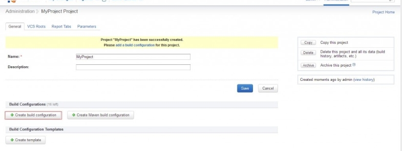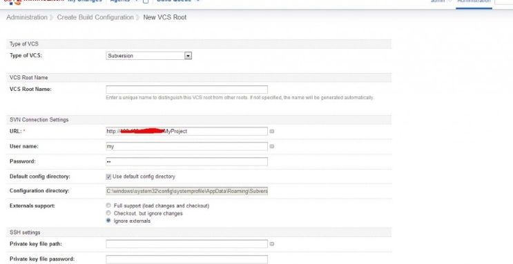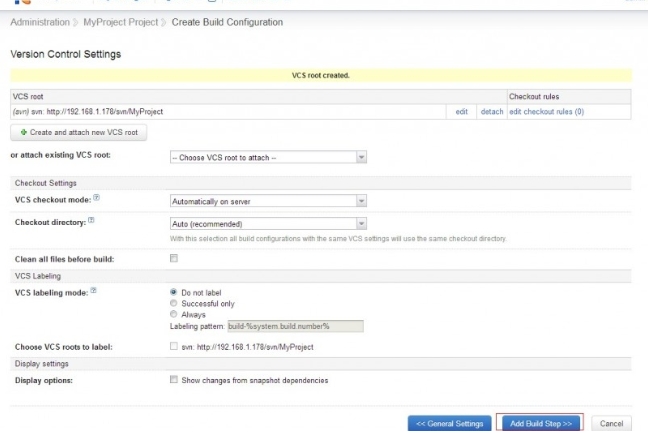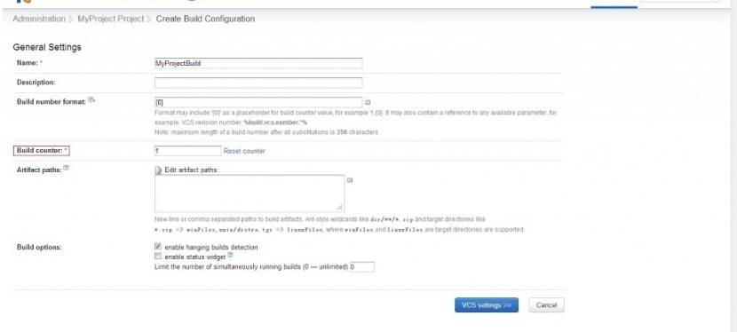 4、非常简单的页面,需要注意的是Build counter这个属性,它会显示你使用这个project进行集成编译的次数,因此在测试完成后你可以清除掉它(置1),在今后的实际管理中根据,编译次数是一个体现团队集成完成速度的量。完成后点VCS setting,