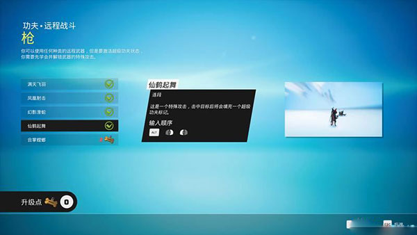 每个功夫的按键顺序和解锁技能点要求都有说明。