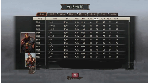 选择一个势力,我们首先得知道我们的优势和劣势。所谓知己知彼方能百战不殆。战争最需要的是什么:当然是人才。一个庞大的强力将领集团往往可抵千军万马。董卓作为典型的西北军阀,优势则是拥有数量众多的强力骑兵将领和数位内政人才,尤其是李儒和邵氏,一个算是全面内政人才,一个则是精于市场开发的经济人才。劣势则是在于外交人才和步兵将领匮乏。而SAN12里面大大削弱了骑兵的冲击威力,所以在后期往中原进发的时候要主要补充强力的步兵将领