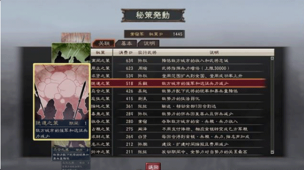 小编认为,绝道之策是一个非常好用的秘策,对一场战局的帮助极大。在三国志12原版中,绝道之策需要三名武将开发,历时5个回合。原版中的绝道之策可以阻止与我方计略府接壤的城市邀请援军,这样我方能够以兵力优势获胜。而在威力加强版中,绝道之策被削弱,由原来的阻止邀请援军改为减少援军数量。但不管如何吧,这依然是一个神策,帮助我们快速夺城。