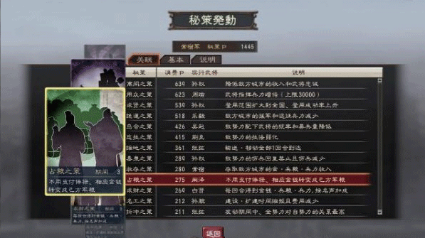 古人云:兵马未动,粮草先行。可见粮草在战争中所起到的作用,每次战争,少则几千,多则数十万,如果没有充足的粮草支撑,根本维持不起军队的消耗。在三国志12中,如果前期发展得太快,很容易遇到无米可炊的情况。小编认为,在游戏的中后期,占粮之策作用极大,能够解决我方大军粮耗问题。前期需要人才,求贤之策就显得十分重要;后期需要粮草。占粮之策也就能发挥出更大的作用。