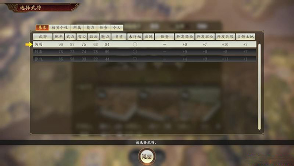 注意官员的武力、政治和智力分别影响兵营、农业和商业。