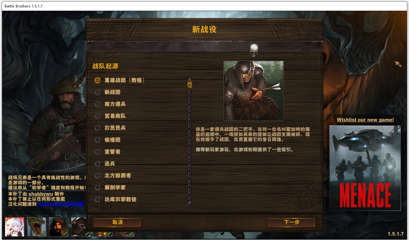 首先,战场兄弟游戏虽然有新手教程模式,但初次进入游戏时,玩家可能会感到有些迷茫。因为游戏一开始就直接进入战斗,没有任何引导,角色交互按键也很小,各种快捷键也没有教程提示,这让人有点摸不着头脑。这可能是小制作组随心所欲的制作习惯导致的,初次体验不太友好。