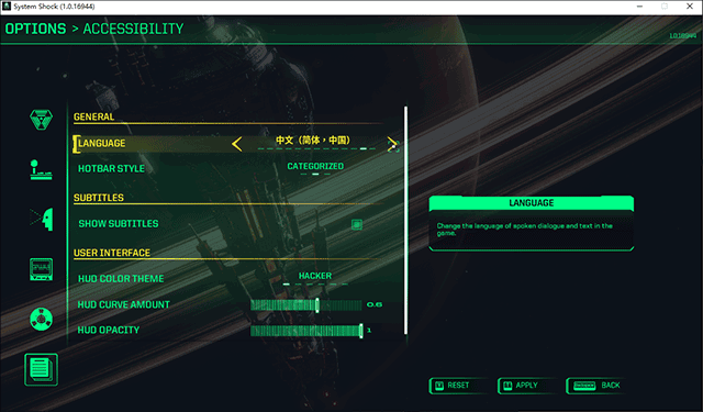 3、在ACCESSIBILITY界面将“Language”选项设置成中文后,选择并点击右下角的“Apply”的选项即可完成中文的设置。