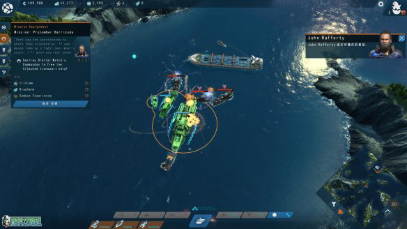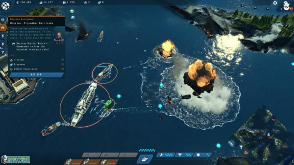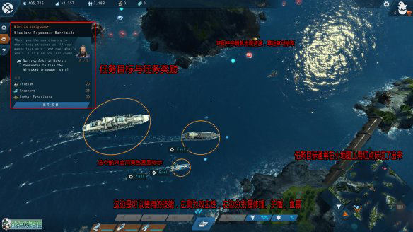 战斗还是比较简单的,需要小心不要碰到敌人的鱼雷。基本上是在路上见什么打什么,技能效果都非常强大,合理的时候使用就可以了。在战斗中击破敌人会掉蓝色的能量,而右下方的三个技能都是需要蓝色能量来释放的。左下方的攻击性技能则是需要在地图上收集到对应图标的资源才可以使用。