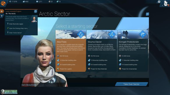 点击上方的旗帜图标即可进入极地的建设,跟温带一样,在开始可以选择发展的地图。