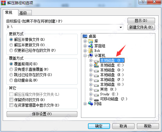 4、选择游戏解压的路径(不要有中文,否则开始不了游戏),小编选择解压在B盘,玩家请自行选择。