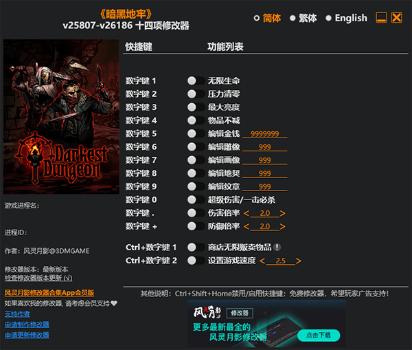 暗黑地牢是一款挺热门的游戏,但玩起来强度太高,很多人可能会被劝退。风灵月影这个修改器就诞生了,它能帮玩家更轻松地游玩。用这个软件的前提是得先下载游戏本体,然后在运行的时候启动修改器就行了。