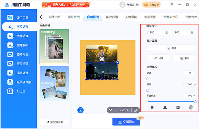 无需复杂操作即可轻松一键拼图,拼图工具箱提供了多种拼图模板可选择,还可以设置各项参数,轻松生成创意图片