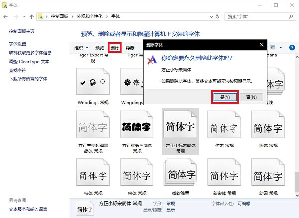 2、选中想要卸载的字体,点击删除,选择是即可。