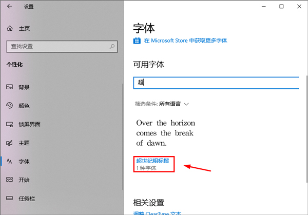 3、安装完成后,打开控制面板,搜索字体设置,然后搜索超世纪粗标楷字体即可使用。