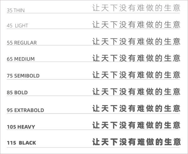 阿里巴巴普惠体2.0版本共包含9款字重,其在原有的5款字重基础上,新增了45Light、65Medium、85Bold、105Heavy等4款字重。本次升级进一步完善了普惠体家族的字重体系,使得排版场景更加丰富和多元。