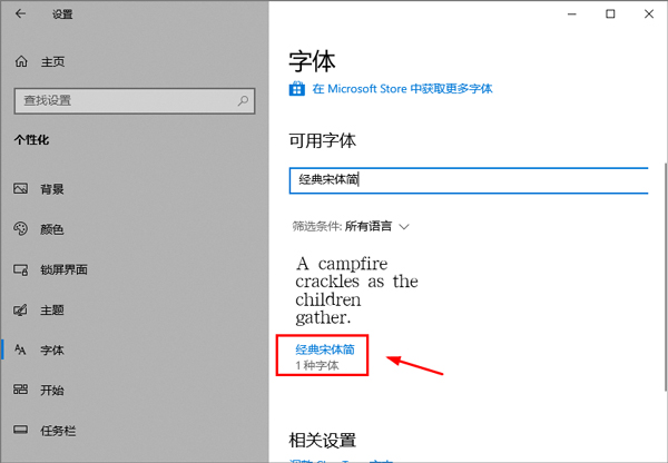 3、安装完成后,打开控制面板,搜索字体设置,然后搜索经典宋体简字体即可使用。