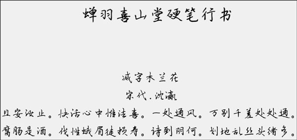 蝉羽喜山堂硬笔行书是一款十分漂亮的中英文字体,并纯手写的作品,引用了硬笔行书的书法,字型优美,笔触适中、用笔流畅自然,适应于报纸和杂志和书籍中常用字体海报、个性促进品牌标志设计、字体设计、文本装潢、信息展示、篆刻制模英文、数据制作、装潢设计、视觉设计、字帖等一切合法应用场景,有喜欢的朋友可免费下载收藏。