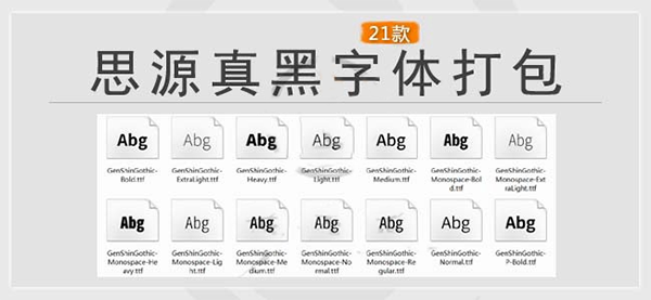 另外本次小编带来了整理打包好的21款思源真黑体,其中集中粗、细、常规、高字重、低字重等等各种风格,欢迎大家前来下载使用。