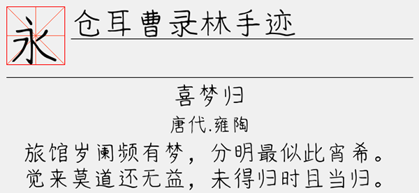 仓耳曹录林手迹w01是由仓耳字库中的一款硬笔手写字体,其字体书写大方简洁,结构清晰更易于识读,并为了突出字体的识读效果,将字体的结构控制的简洁大方,布白更加均匀,字体更显清晰。总之字体整体给人以心情喜悦、轻松的感觉,字体骨骼清秀、遒劲有力,清冽而又优雅、从容,令人心旷神怡,可以很好的应用于文本装潢、信息展示、网页设计、篆刻制模、数据制作、装潢设计、计算艺术设计、视觉设计、字帖等一切合法应用场景,有喜欢的朋友可免费下载收藏。