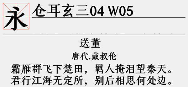 仓耳玄三04 w05字体是一款创新型的家族字体之一,其字体在结构上结合了楷体和明代宋体的字型结构,在笔形上具有弧线的创新处理,使字体具有明代宋体风格的同时又不会太过张扬,活泼中略显大气,是古代与现代的完美结合,使读者阅读轻松的同时还能体会到古体书法的神韵,并且中英文、阿拉伯数字全面支持,可以很好的应用于文本装潢、信息展示、网页设计、篆刻制模、数据制作、装潢设计、计算艺术设计、视觉设计、字帖等一切合法应用场景,有喜欢的朋友可免费下载收藏。