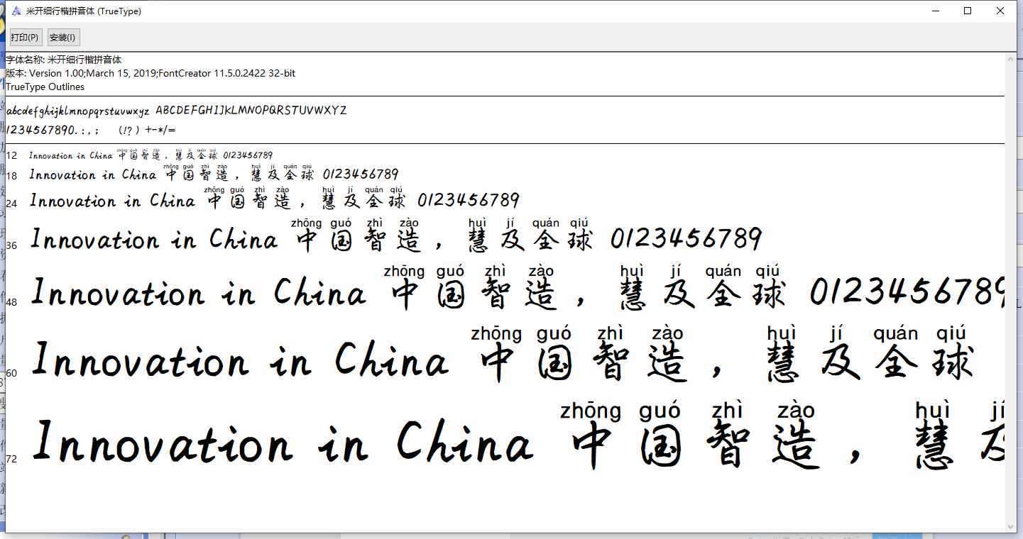 米开细行楷拼音体是一款十分漂亮的中文电脑字体,同时也是由米开字库倾情发布的作品,字体字型传承了行书与楷书两种元素,笔画的横纵比例也是堪称完美,整体看来相当不错,适应于报纸和杂志和书籍中常用字体海报、个性促进品牌标志设计、字体设计、文本装潢、信息展示、篆刻制模英文、数据制作、装潢设计、视觉设计、字帖等一切合法应用场景,有喜欢的朋友可免费下载收藏。