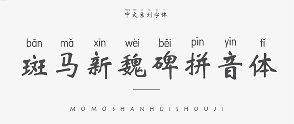 斑马新魏碑拼音体字体是一款带拼音的中文字体,其字体笔锋如行云流水,笔画细腻,非常的漂亮,并强化了折笔处的外方内圆,撇、捺的收笔处带有装饰性饰角,可以很好的应用于文本装潢、信息展示、网页设计、篆刻制模、数据制作、装潢设计、计算艺术设计、视觉设计、字帖等一切合法应用场景,有喜欢的朋友可免费下载收藏。