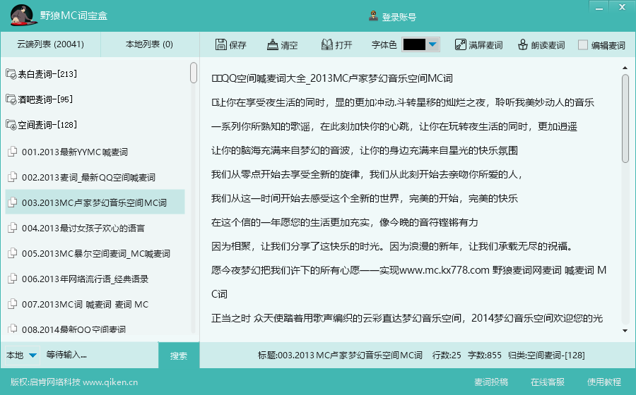 万首各类MC喊麦词,在线实时同步更新,同时欢迎大家上传你的麦词到网站上。
